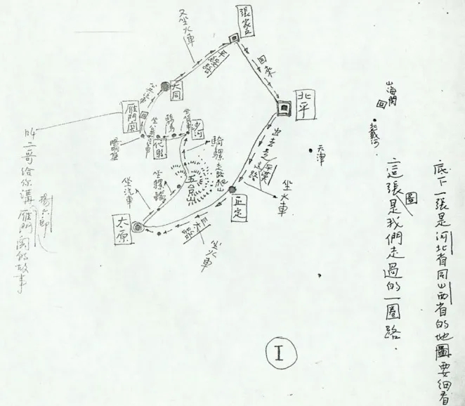 林徽因的文體又變了,和寫詩(shī)、寫建筑學(xué)論文不同,跟小孩子寫的文字是這樣的。她還詳細(xì)畫了一張圖叫“我們走過(guò)的一圈路”,讓孩子在這么危急的關(guān)頭還順便學(xué)一學(xué)地理知識(shí)。