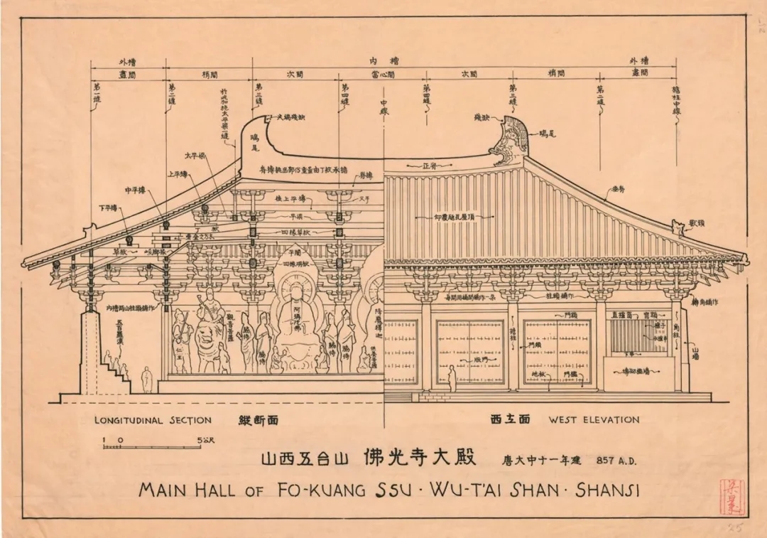 營(yíng)造學(xué)社整個(gè)古建筑考察最輝煌的時(shí)刻,是1937年7月在山西五臺(tái)山佛光寺發(fā)現(xiàn)唐代木構(gòu)建筑,這是梁、林人生當(dāng)中最重要的古建筑發(fā)現(xiàn)。此前日本學(xué)者關(guān)野貞(伊東忠太的學(xué)弟)曾經(jīng)放話說(shuō)中國(guó)沒(méi)有任何唐代木構(gòu)建筑遺存,要看唐代木構(gòu)就上日本奈良吧。梁、林就一直想爭(zhēng)口氣,找到中國(guó)大地上的唐代木構(gòu)。