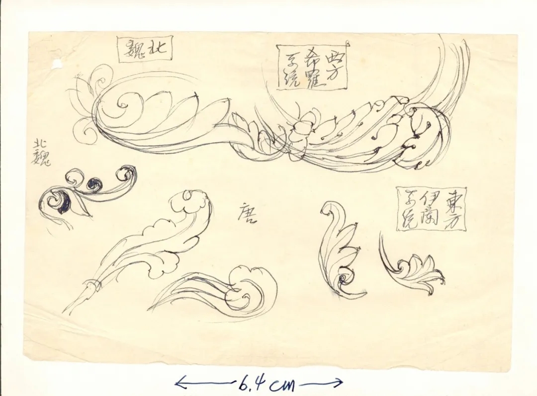 此時(shí)期林徽因還在做一些建筑史的研究,可惜只有殘缺的稿子,沒(méi)有最終完成,是繼云岡石窟以后對(duì)敦煌石窟紋飾的研究——《敦煌邊飾初步研究稿》。此時(shí)她已經(jīng)能輕松地畫出北魏、唐代紋飾什么味道,波斯以及希臘紋飾又是什么味道。