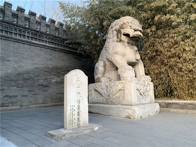 此地建筑由留英建筑師沈琪設(shè)計(jì),稱得上美輪美奐。一百多年過去,桁梁依舊堅(jiān)實(shí),雕花依舊精美,冬日陽光照耀其上,兀然有穿越之感。它們和門前的石獅一起,見證了一段“城頭變幻大王旗”的歷史:1911年清帝遜位,帝制完結(jié);1912年這里變成了袁世凱的總統(tǒng)府;1924年又變成了段祺瑞執(zhí)政府所在地,1926年段祺瑞當(dāng)政期間制造的“三·一八”血腥慘案,就發(fā)生在這對石獅子的前方。如今大門東側(cè)石獅旁邊,立著一尊樸素的漢白玉石碑,上書“‘三·一八’慘案發(fā)生地”八個(gè)大字。