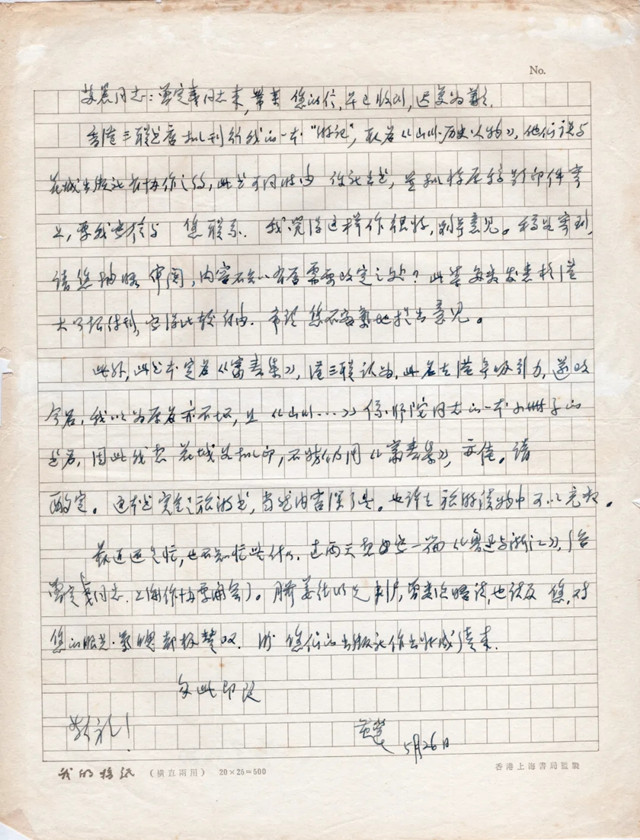 五通信札均為鋼筆書寫,文字內(nèi)容著錄于2019年齊魯書社出版的《榆下夕拾》中,但個(gè)別字句有釋讀錯(cuò)誤。第一通信札書寫在20×25=500的十六開稿箋紙上,橫寫,稿紙下側(cè)印有“我的稿紙(橫直兩用),香港上海書局監(jiān)制”字樣。信札書文曰: