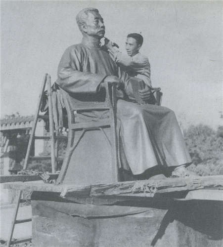 魯迅塑像翻制成銅像。圖為原作者蕭傳玖教授在修琢銅像。
