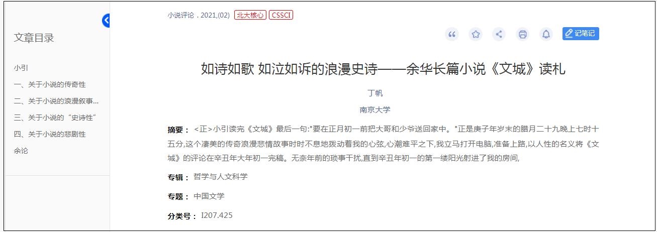 丁帆《如詩(shī)如歌 如泣如訴的浪漫史詩(shī)——余華長(zhǎng)篇小說<文城>讀札》,發(fā)表于《小說評(píng)論》2021年第2期。