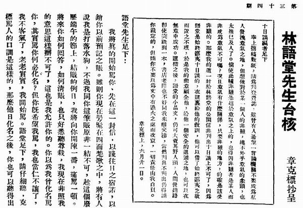 謝其章先生寫過一篇《〈論語〉之初發(fā)生了什么》(收入《繞室旅行記》,商務(wù)印書館2016年8月版),其中引用了章克標(biāo)寫于1934年的《林語堂先生臺(tái)核》一文。此文因彼時(shí)的章林矛盾而作,對(duì)林語堂多有筆伐。這樁公案無關(guān)本文,故不展開。珍貴的是,章克標(biāo)在文中披露了不少《論語》的籌備“內(nèi)幕”,可與其晚年敘述相映證: