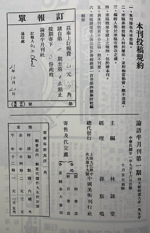 《論語》創(chuàng)刊號(hào)版權(quán)頁,上海書店影印