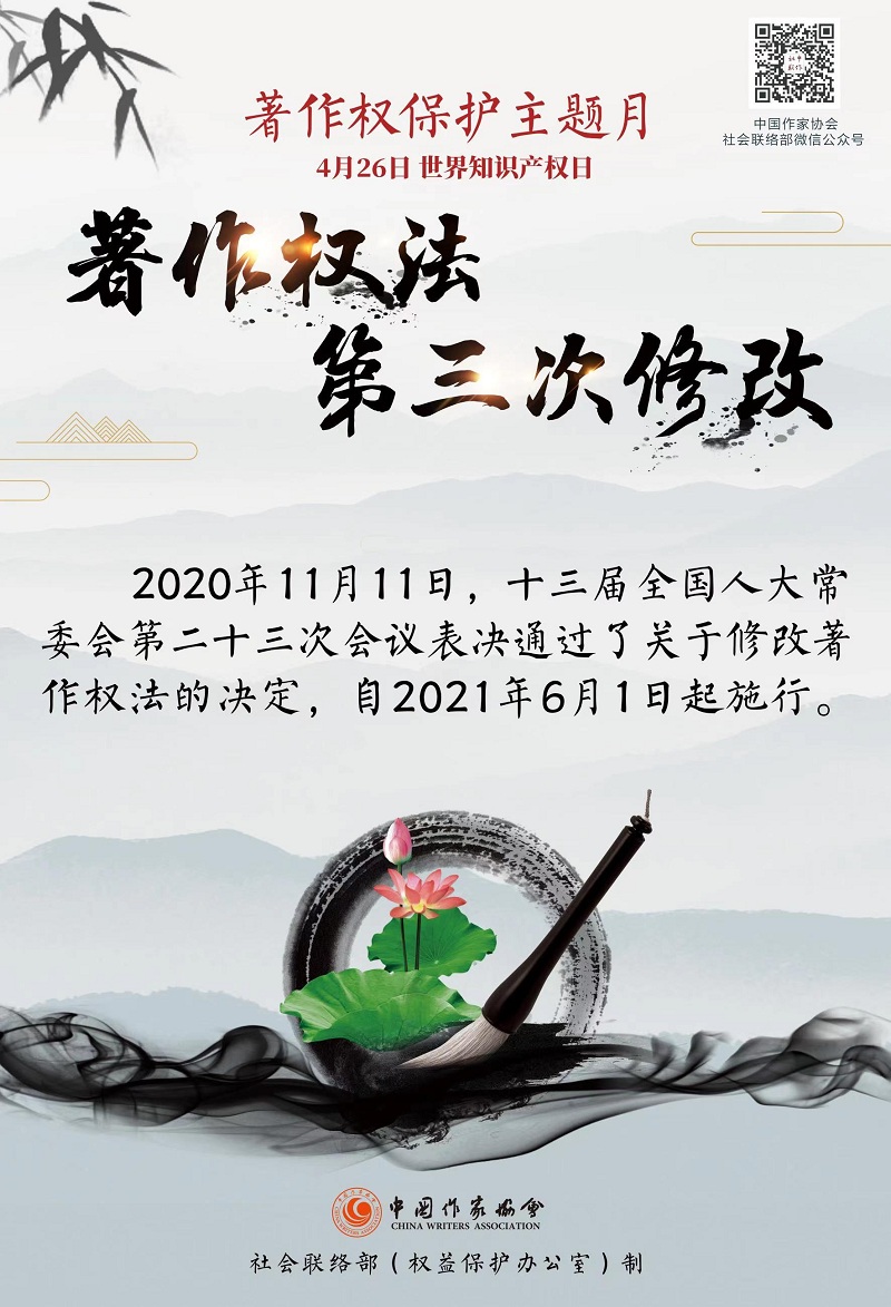 今年4月26日是第21個世界知識產(chǎn)權日。為深入學習貫徹習近平總書記在中央政治局集體學習時關于知識產(chǎn)權工作的重要講話精神,宣傳推廣2021年6月1日施行的新修改的《著作權法》,營造濃厚的著作權保護氛圍,增強廣大作家尊法學法守法用法的意識和能力,探索著作權保護工作的新思路、新辦法,中國作家協(xié)會社會聯(lián)絡部(權益保護辦公室)于本月正式啟動“著作權保護主題月”活動。