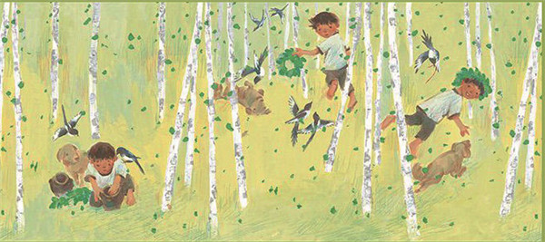 給年幼兒童的繪本,也應(yīng)該適度地進(jìn)行挫折教育、苦難教育。令我欽佩的是,《喜鵲窩》所反映的嚴(yán)酷的沙漠生活里的艱辛、磨難,并不是被大呼小叫地喊出來的,而是不動聲色地表現(xiàn)出來的。之所以能不動聲色,是因為作品背后有強大的信念在支撐。沙娃一家的家園被毀后,文字故事以走向沙漠深處結(jié)束,但是,后環(huán)襯依然在敘述故事。在后環(huán)襯上,近處有繁茂的白楊樹和“海子”,遠(yuǎn)處浮現(xiàn)出了綠洲。綠色,是希望的顏色。這顯然昭示了災(zāi)難后的希望,表現(xiàn)了樂觀主義的人生觀。對于寫給年幼兒童的繪本,表現(xiàn)虛無和悲觀,是死亡的暗示,表現(xiàn)達(dá)觀和樂觀,則是對生命的鼓舞。