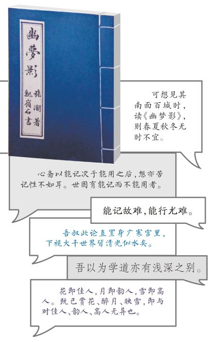 去年讀報,看到宗璞先生談?wù)磉厱鴷r,說到《幽夢影》,認(rèn)為書中表現(xiàn)的是“中國文化的審美情趣。”宗璞先生文字絕佳,散文凝練而溫文,是否也受到張潮一些影響?至于此書是否表現(xiàn)了“中國文化的審美情趣”?筆者還不能全然認(rèn)可。從時代看,《幽夢影》描摹的“情趣”,頗為精致,同時單薄,少了《詩經(jīng)》的質(zhì)樸,《楚辭》的飛揚華美,漢唐的金戈鐵馬……它是明清時期的表達,可以成為我們認(rèn)識此時文人情趣部分。當(dāng)然,當(dāng)時居然有“跟帖”風(fēng)習(xí),更有文字記錄下來,這又讓我們感覺意外,當(dāng)然,同時也感佩古人的創(chuàng)獲。