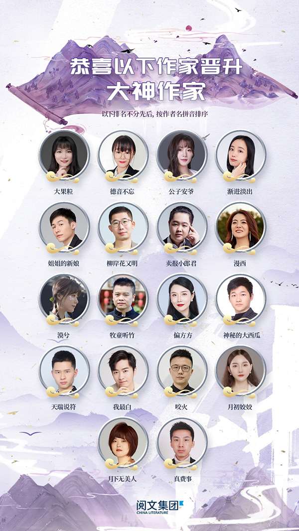 今年“白金大神”名單中,老鷹吃小雞、陳詞懶調(diào)、飛天魚、錦凰、云芨、顧南西等6位作家晉升“白金”,漫西、月下無美人、柳岸花又明、天瑞說符、賣報小郎君等18位作家“成神”。