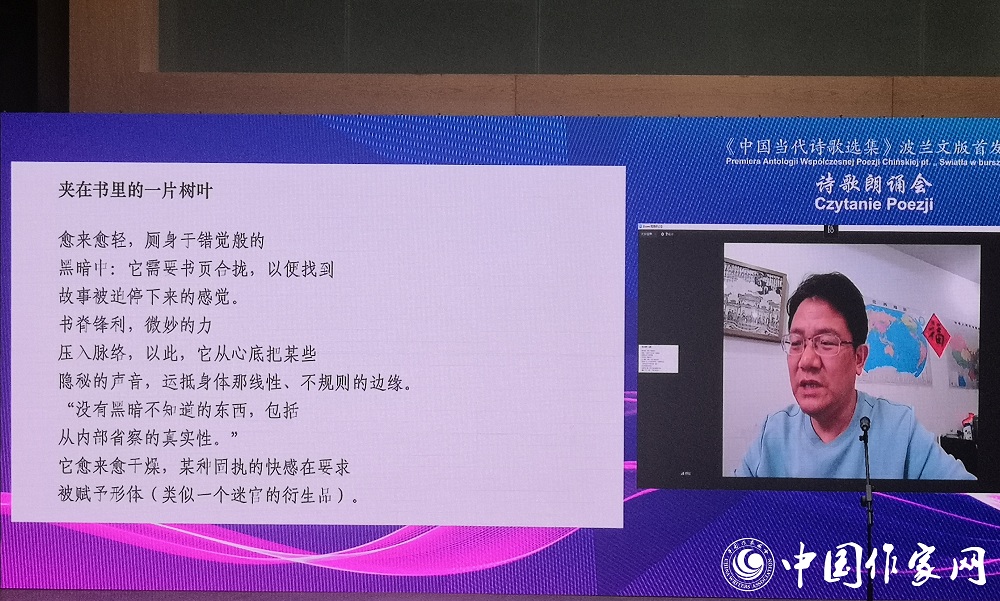 在詩歌朗誦會(huì)環(huán)節(jié),吉狄馬加深情朗誦了新近創(chuàng)作的長詩《裂開的星球》(節(jié)選),表達(dá)出對人類生存環(huán)境與未來命運(yùn)的深切思考,引起現(xiàn)場觀眾共鳴。湯養(yǎng)宗、胡弦、陳先發(fā)、張執(zhí)浩等中國詩人和李周、卡塔基娜·薩雷克等波蘭譯者分別用漢語和波蘭語,在現(xiàn)場和線上朗誦了《在漢詩中國》《平安夜》《夾在書里的一片樹葉》《琥珀里的昆蟲》《晚星》《古老的信封》《被詞語找到的人》等入選本詩集的作品。詩人和譯者的精彩演繹引發(fā)陣陣掌聲,現(xiàn)場觀眾在漢語和波蘭語的音律之美中穿行,領(lǐng)略了詩歌跨越語言的獨(dú)特魅力。