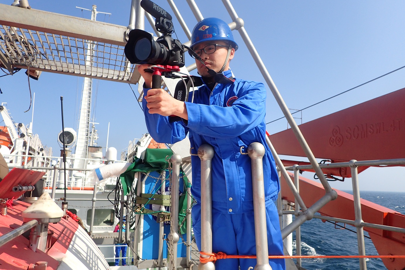 作者跟蹤拍攝蛟龍?zhí)栐谔窖箝_展科學(xué)考察,此時(shí)科考隊(duì)員正在為蛟龍做保養(yǎng),作者舉起攝像機(jī)記錄每一個(gè)工作瞬間