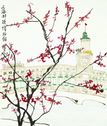 知名畫家楊正新的《上海郵政博物館》,有著傳統(tǒng)海派繪畫的筆墨意趣和生活氣息,又兼有現(xiàn)代繪畫的形式感和表現(xiàn)性。簡約的畫面準確抽取了該建筑最靈動的輪廓線條及郵政綠色彩,將“遠東第一大廳”的外墻橫跨了宣紙界面,隨形就勢勾勒出橋面。