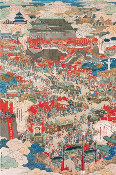 伴隨著解放戰(zhàn)爭(zhēng)走向勝利的鏗鏘步伐,一座座城市宣告解放,人民解放軍陸續(xù)舉行了盛大的入城式,展現(xiàn)其高昂的士氣,迎接新中國(guó)的誕生。與此同時(shí),出現(xiàn)了一批以解放軍入城式為主題的美術(shù)作品。新中國(guó)成立后,不少美術(shù)工作者持續(xù)從不同視角、以各種形式詮釋這一主題,其中以對(duì)北平、南京、上海三座城市歡慶解放的描繪最具代表性。