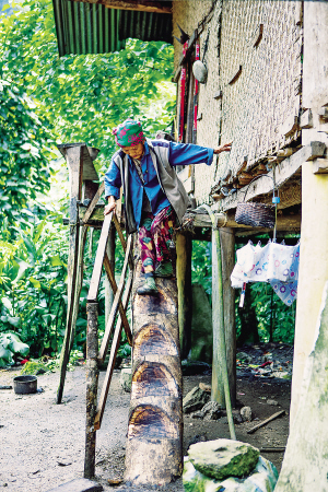 獨龍族傳統(tǒng)住房分為木壘房和篾笆房兩種,為了防潮、防霉、防野獸而離地建蓋。房屋與地面相連的獨木梯用一根圓木鑿出一個個臺階制成。攝于2013年。 楊學飛攝