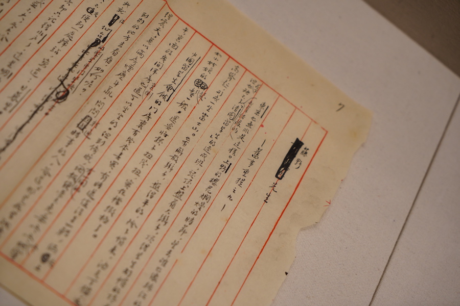 1946年7月15日,聞一多被國(guó)民黨特務(wù)暗殺身亡,同年11月,清華大學(xué)成立“整理聞一多先生遺著委員會(huì)”,由朱自清領(lǐng)銜,發(fā)動(dòng)清華大學(xué)中國(guó)文學(xué)系同仁搜集、整理、抄寫聞一多未刊遺稿,后出版。展覽現(xiàn)場(chǎng)中展出一件朱自清手書的序言,其中多處修改,也提及聞一多“終于要研究起唯物史觀,要在這個(gè)基礎(chǔ)上建筑起中國(guó)文學(xué)史”。