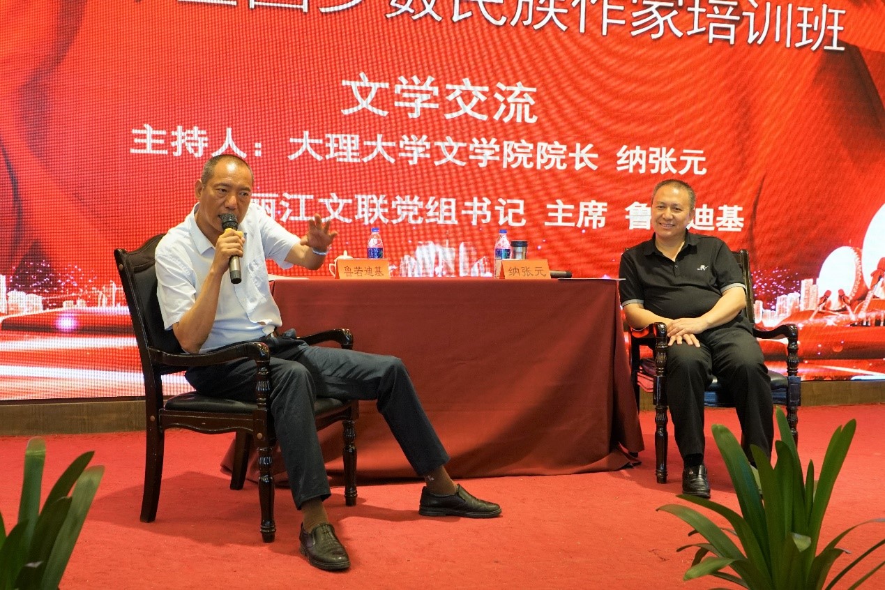 培訓(xùn)班期間,還舉辦了一場(chǎng)名家對(duì)談,麗江市文聯(lián)黨組書(shū)記、主席魯若迪基與大理大學(xué)文學(xué)院院長(zhǎng)納張?jiān)獌晌簧贁?shù)民族作家基于自身創(chuàng)作,對(duì)少數(shù)民族文學(xué)的創(chuàng)作空間展開(kāi)了探討。魯若迪基以自己的詩(shī)《1958年》開(kāi)篇,講述了對(duì)少數(shù)民族文學(xué)的整體看法。他認(rèn)為,新中國(guó)成立后,在黨的領(lǐng)導(dǎo)下,瀕臨滅絕的少數(shù)民族口傳文學(xué)得到了搶救和保護(hù),少數(shù)民族作家也開(kāi)始拿起筆來(lái)撰寫(xiě)自己民族的故事。他很關(guān)注近些年的脫貧攻堅(jiān)文學(xué)創(chuàng)作,認(rèn)為少數(shù)民族文學(xué)創(chuàng)作要深入生活,挖掘和書(shū)寫(xiě)本民族靈魂深處的東西;同時(shí)也要向外探測(cè),開(kāi)拓新的創(chuàng)作領(lǐng)域。納張?jiān)獎(jiǎng)t認(rèn)為,為民族代言,為民族立傳,幾乎是每一個(gè)少數(shù)民族作家與生俱來(lái)的創(chuàng)作理想和創(chuàng)作使命。我們敬重這種責(zé)任意識(shí)和擔(dān)當(dāng)精神,同時(shí)文學(xué)創(chuàng)作具有特殊性,好作品也需要充分彰顯作家的個(gè)性,作家的獨(dú)特個(gè)性是作品騰飛的翅膀。