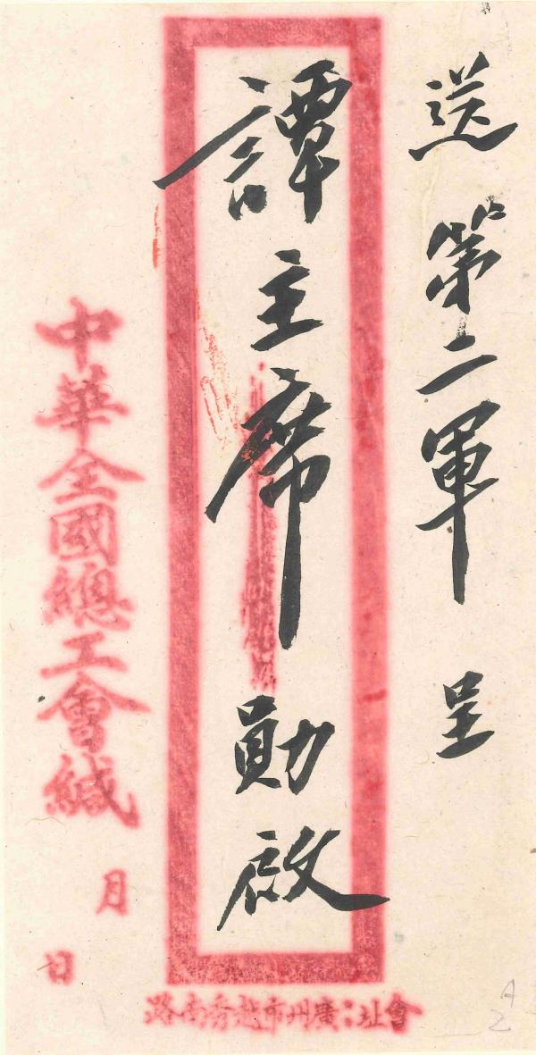 該札封套正中墨書“送第二軍呈譚主席勛啟”,封左下印有“中華全國總工會緘”,作扁體關(guān)防字樣。