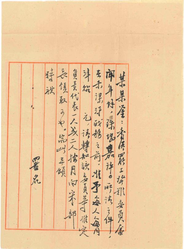 香港罷工發(fā)難委員奮斗年余,殊堪嘉許。所請之件,在未謀得職務(wù)之前,準(zhǔn)予每人每月津貼囗元。請轉(zhuǎn)知該委員等推定負(fù)責(zé)代表一人或二人按月向宋部長領(lǐng)取可也,端此并頌時(shí)祺。