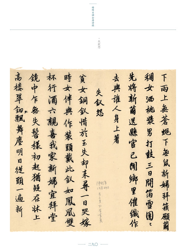 從楊絳先生在手稿上標(biāo)記的日期判斷,她的抄錄工作始于一九八三年一月一日,結(jié)束于一九九一年六月十九日。大概從一九八五年開始,她比較有規(guī)律地堅(jiān)持每天抄錄一點(diǎn),從一九八八年開始,幾乎每天還標(biāo)記了日期。如果說,經(jīng)過整理、注釋和排印的《錢鍾書選唐詩》,主要體現(xiàn)了錢先生選詩的標(biāo)準(zhǔn),由楊先生親手抄錄并命名的《楊絳日課全唐詩錄》,則展示了她在上世紀(jì)八十年代中后期,堅(jiān)持課詩、習(xí)書的日常生活。其中有些批語,頗能加深我們對(duì)此的印象。如第二九〇頁,在《失釵怨》題下注云:“一九八五年十二月二十四日,已三月不學(xué)書矣?!钡谌帕摗端偷吩娔┳⒃疲骸耙痪虐肆晔氯蝗赵囆鹿P。”第五二一頁《長(zhǎng)恨歌》旁批:“一九八八年一月一日開新筆?!钡谖逦迦摚涗浟艘痪虐税四耆隆笆?,切芥菜一個(gè),手抖不能寫字”等等,都包含著豐富的個(gè)人信息。