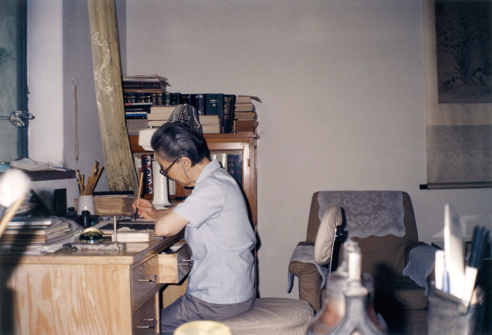錢鍾書先生和楊絳先生在楊先生“唐詩日課”的習(xí)字桌前合影