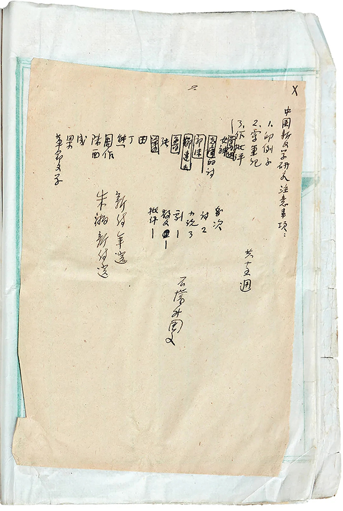 “B稿是三個版本中最豐厚的一部分。該稿全為手稿,貼襯在‘清華大學’綠絲欄箋紙上,是開課時的講稿。朱自清先生在前面開宗明義地列了三條新文學研究的方法說明:“印例子”、“索筆記”、“假(借)批評”。我認為這三條既體現(xiàn)了朱先生一輩子研究文學史所遵循的學術方法,也特別值得我們今天的人遵循。這個在全集本里頭是沒有的?!?/p>