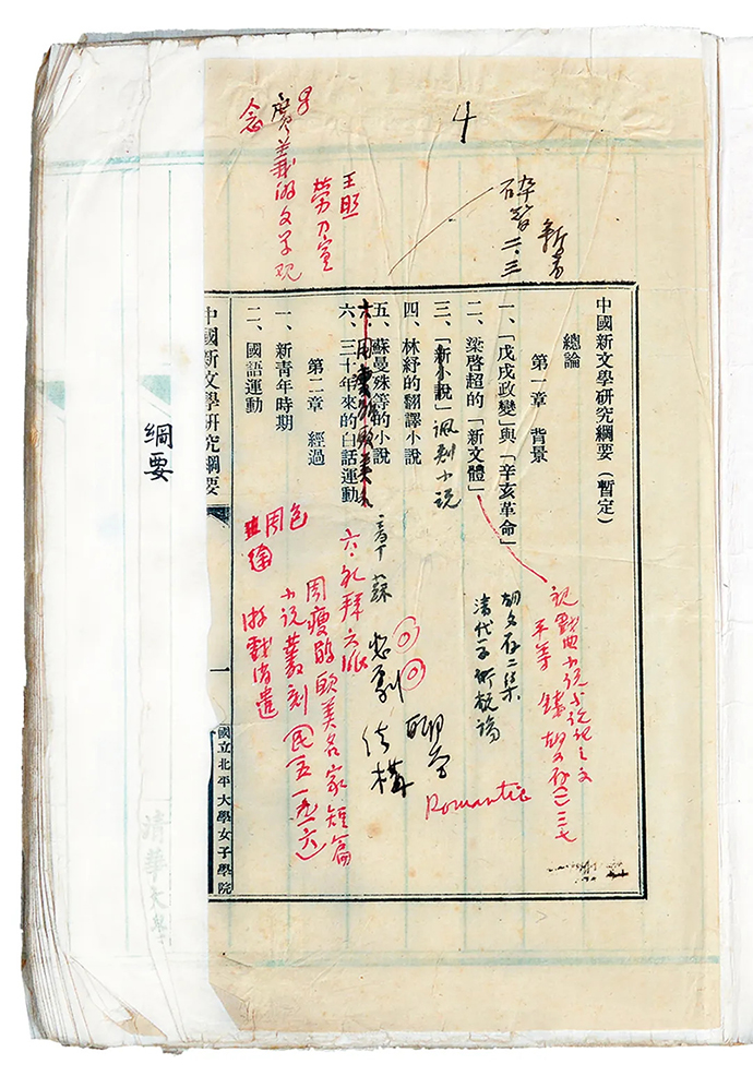 該手稿封面有“十八年”字樣,前面綱要中有幾小時講完字樣,顯然為1929年講課所用,同時也是存世最完整本。鉛印綱要目錄豎式打印,打印框左邊上有“中國新文學研究綱要”字樣,左下為“國立北平大學女子學院”字樣,打印紙粘貼在清華大學箋紙上。