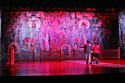 《永樂(lè)宮紀(jì)事》創(chuàng)造性地將蒲劇、歌劇、舞劇、話劇、音樂(lè)劇等多種藝術(shù)形式有機(jī)結(jié)合、融為一體,在充分利用地域文化元素的同時(shí),還將珍貴的永樂(lè)宮壁畫(huà)與現(xiàn)代聲光電等舞臺(tái)技術(shù)有機(jī)結(jié)合,營(yíng)造出絢麗多彩的舞臺(tái)效果。
