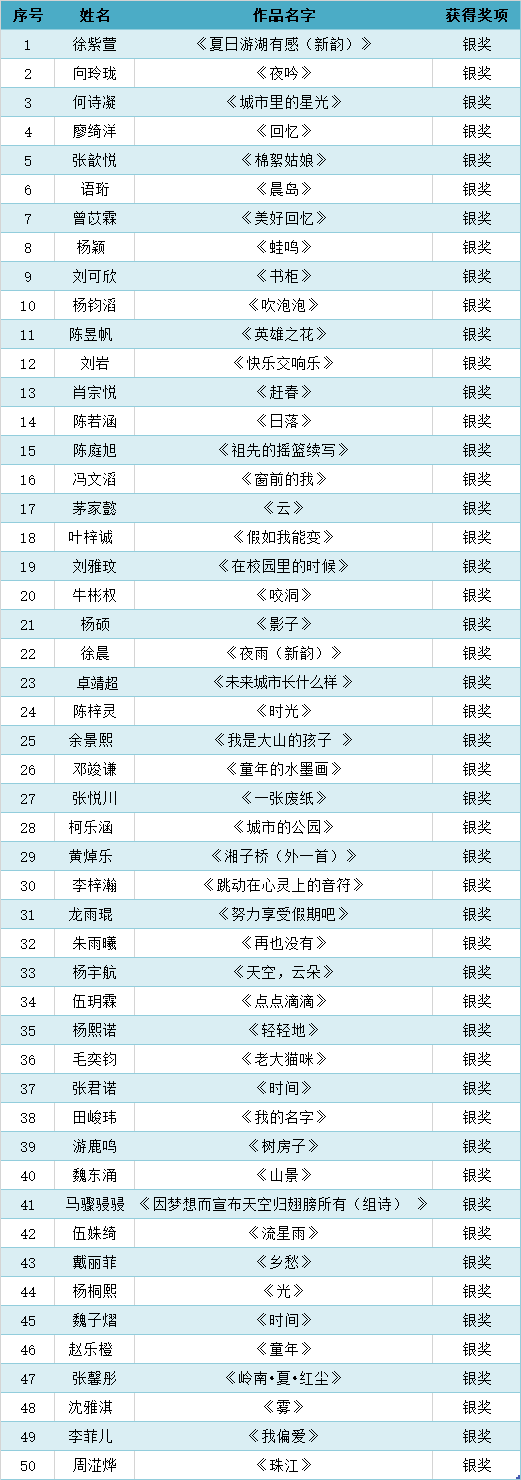 首屆珠江兒童詩歌獎以“理想城市”“美好回憶”“嶺南風物”為主題,廣泛向國內16歲以內的少年兒童征集現(xiàn)代詩和舊體詩。截止2021年6月1日,共收到參賽作品700多件。經(jīng)評委初評,共有170個作品進入復選(網(wǎng)絡票選)。最終,結合網(wǎng)絡票選結果和評委意見,終評出金獎20名、銀獎50名、銅獎80名、網(wǎng)絡最佳人氣獎20名。