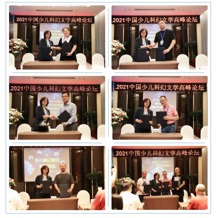 論壇上,北方文藝出版社與中國(guó)兒童文學(xué)研究會(huì)兒童劇委員會(huì)、成都萌寵神番動(dòng)漫制作有限公司、成都聲娛文化傳播有限公司、陸楊工作室等機(jī)構(gòu)簽訂戰(zhàn)略合作協(xié)議,并就“超幻俠”系列等重點(diǎn)少兒科幻作品進(jìn)行現(xiàn)場(chǎng)簽約;會(huì)上同時(shí)成立了“北方文藝出版社少兒科幻、科普作家培養(yǎng)基地”,并就成立“全國(guó)少兒科幻文學(xué)作家聯(lián)盟”探討了相關(guān)事宜。