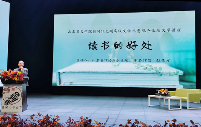 本次活動邀請到了山東省作家協(xié)會原副主席、著名作家趙德發(fā),山東省作家協(xié)會副主席、著名作家鐵流作為志愿者代表,在墾利區(qū)分別為基層作家和文學(xué)愛好者以及墾利一中的部分同學(xué)們帶來了生動的文學(xué)講座。講座由山東省作家協(xié)會主席團(tuán)成員、著名作家東紫主持。趙德發(fā)以“讀書的好處”為題,與現(xiàn)場文學(xué)愛好者分享了自己的讀書心得以及《經(jīng)山?!穭?chuàng)作經(jīng)歷。鐵流以“紅色經(jīng)典依然具有強(qiáng)大的生命力”為題,與同學(xué)們分享了許多紅色經(jīng)典故事,通過故事讓同學(xué)們體會思考我們現(xiàn)在生活的來之不易。講座結(jié)束后,文學(xué)院進(jìn)行了關(guān)于新時代文明實(shí)踐活動以及培訓(xùn)工作的專題調(diào)研,調(diào)研活動取得了預(yù)期效果,基層作家提出多條意見建議,對下一步工作具有較強(qiáng)的參考意義。