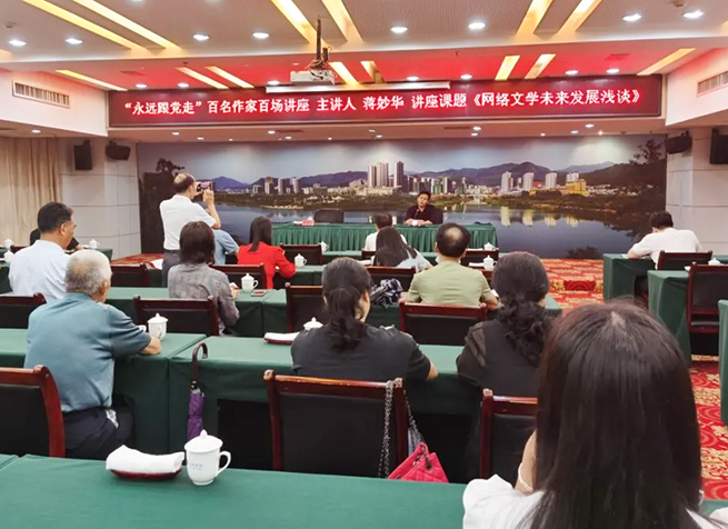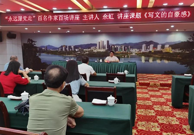 6月24日,由福建省文聯(lián)、福建省作協(xié)、福建省文評協(xié)、福建省文聯(lián)文藝志愿團文學分團、福建省文聯(lián)文藝志愿團文評協(xié)分團、三明市文聯(lián)主辦,福建省作協(xié)網(wǎng)絡(luò)文學專委會承辦,三明市作協(xié)、三明市文藝院、將樂縣文聯(lián)、將樂縣作協(xié)協(xié)辦的“永遠跟黨走·百名作家百場講座”活動在將樂縣舉行。此次活動邀請了中國作家協(xié)會會員、將樂籍網(wǎng)絡(luò)作家余虹,福建省作協(xié)會員、網(wǎng)絡(luò)作家蔣妙華前來授課,將樂縣作協(xié)主席肖勝龍主持講座。來自將樂縣的文學愛好者聆聽了講座。