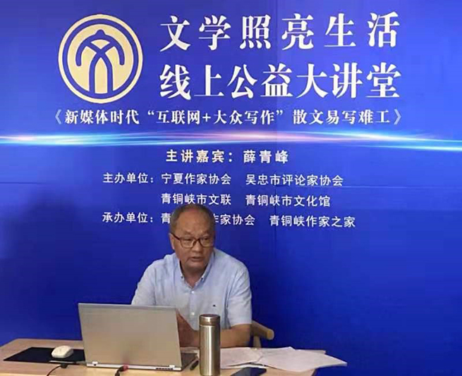 6月27日上午,為迎接中國共產(chǎn)黨100歲華誕,貫徹落實(shí)習(xí)近平總書記關(guān)于文藝工作的重要論述,發(fā)揮文藝工作者以文化人、以文育人的優(yōu)勢,由寧夏作家協(xié)會、吳忠市文藝評論家協(xié)會、青銅峽市文聯(lián)、青銅峽市文化館主辦,青銅峽市作家協(xié)會、青銅峽作家之家創(chuàng)研培訓(xùn)基地承辦的“文學(xué)照亮生活”線上線下公益大講堂在青銅峽作家之家成功舉辦。寧夏作家協(xié)會副秘書長張濤主持并致辭。國家二級作家、寧夏理工學(xué)院副教授、石嘴山市文藝評論家協(xié)會主席薛青峰受邀擔(dān)任主講嘉賓。