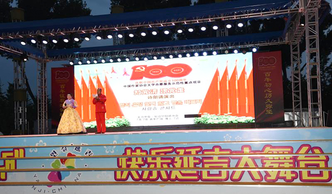為慶祝中國共產(chǎn)黨成立100周年,學(xué)習(xí)貫徹習(xí)近平總書記“七一”重要講話精神,激發(fā)奮進力量,7月7日晚,中國作家協(xié)會2021年文學(xué)志愿服務(wù)示范性重點扶持項目——“知黨情 跟黨走”詩歌朗誦演出在延吉青年廣場“延吉快樂大舞臺”舉行。延邊詩朗誦協(xié)會詩歌朗誦藝術(shù)家及詩朗誦愛好者、延邊大學(xué)學(xué)生等70多人參加詩歌朗誦演出,為廣大市民獻上一場文學(xué)盛宴。