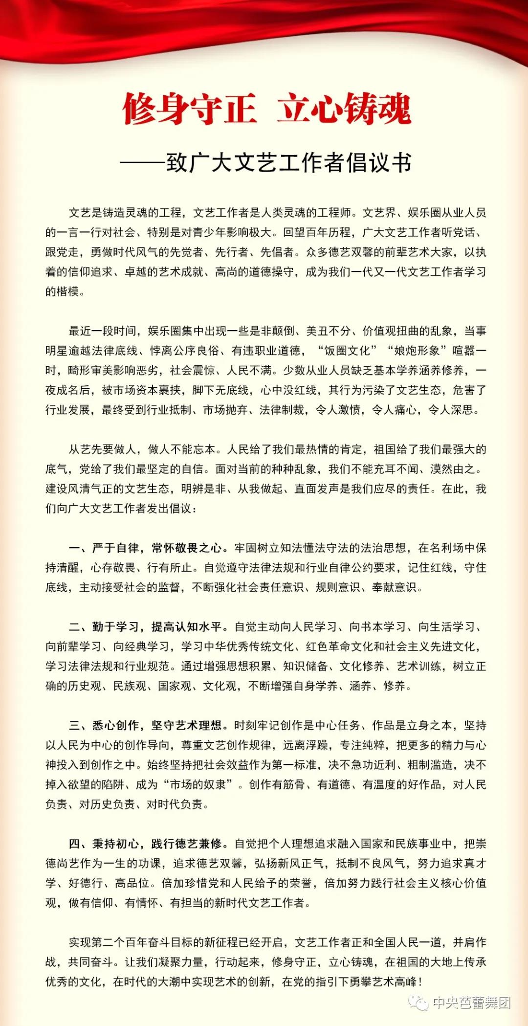 中央芭蕾舞團(tuán)全體藝術(shù)家積極響應(yīng)中國文聯(lián)《修身守正 立心鑄魂——致廣大文藝工作者倡議書》