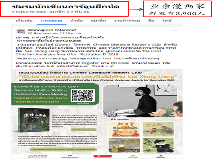 活動(dòng)進(jìn)行過程中,在線讀者紛紛留言,對熊亮的作品給予了高度評價(jià),并希望熊亮的作品可以走進(jìn)泰國,讓泰國讀者切身感受其中的神秘世界,促進(jìn)中國童書走進(jìn)海外市場?;顒?dòng)也得到了泰國《世界日報(bào)》《亞洲日報(bào)》等重要紙媒的爭相報(bào)道。同時(shí),在Facebook等社交平臺(tái)上設(shè)立了多個(gè)粉絲群組,粉絲高達(dá)8600人。