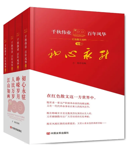 《千秋偉業(yè) 百年風(fēng)華》這套書包括《初心永駐》《崢嶸歲月》《人民萬歲》《江山如畫》4卷,精選了老一輩無產(chǎn)階級革命家、現(xiàn)當(dāng)代著名作家撰寫的數(shù)百篇紅色經(jīng)典散文。作者們或以親身經(jīng)歷或通過深度現(xiàn)場采訪和細(xì)致的資料爬梳,記錄了一段偉大而榮光的崢嶸歲月,描繪出一幅中國革命、建設(shè)、改革以及新時代波瀾壯闊的宏偉畫卷。書中既有老一輩無產(chǎn)階級革命家的高瞻遠(yuǎn)矚、抒情言志,又有一代代革命事業(yè)后來人的嘉言懿行、高風(fēng)亮節(jié);既有崢嶸歲月里無數(shù)英烈先賢的壯懷激烈、出生入死,又有硝煙散盡后廣大勞動者的艱苦創(chuàng)業(yè)、無私奉獻(xiàn);既有風(fēng)展紅旗的高歌猛進(jìn),又有山重水復(fù)的曲折回旋;既有踏訪革命圣地的綿綿思緒,又有沉吟紅色經(jīng)典的涌動情潮……全書飽含著家國情懷、人民情懷,彰顯著愛國主義精神、英雄主義精神,承載著熠熠生輝的思想光澤和精神力量,堪為進(jìn)行紅色革命傳統(tǒng)教育的寶貴教材。