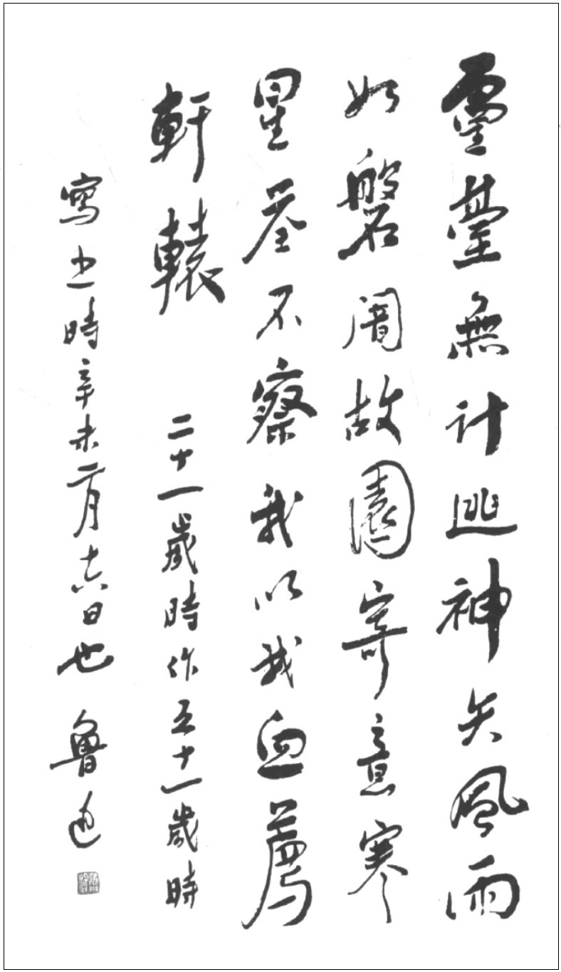 “靈臺無計逃神矢,風(fēng)雨如磐暗故園。寄意寒星荃不察,我以我血薦軒轅。二十一歲時作,五十一歲時寫之,時辛未二月十六日也。魯迅?!保?biāo)點為編者所加)《自題小像》詩作于1903年,現(xiàn)存三幅,上圖為其中之一,是1933年魯迅重錄的。相比于其他文體的手跡,魯迅詩稿是更純粹意義上的書法作品。魯迅研究專家蕭振鳴對這幅字的書法藝術(shù)評析道,“豎寫四列,跋詞字號略小,字體寬博厚重,第一個‘靈’字引首,大有黑云壓城之勢,‘風(fēng)雨’二字盡顯行書的灑脫,‘磐’字出筆沉穩(wěn),‘闇’‘園’二字圓轉(zhuǎn)處澀意濃重,遲緩有度,‘血’字具有強烈的感情色彩,力透紙背。通觀全篇,起筆沉穩(wěn),收筆少有出鋒,書法樸茂厚重,一氣呵成,具有強烈的視覺美感?!?/p>
