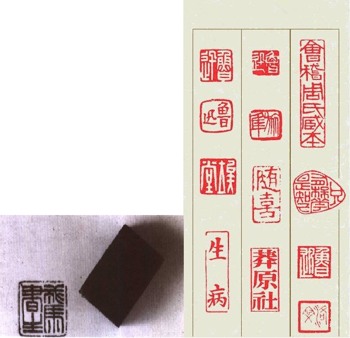 治印識印是中國文人的一大特征。魯迅叔父周芹候擅長篆刻,少年時耳濡目染下,魯迅也對刻印有過了解。在魯迅改定的《<蛻龕印存>序》中,他僅用四百余字就講解了印章的傳說、起源、發(fā)展和審美價值。南京求學(xué)時期,魯迅也曾自刻過“文章誤我”“戛劍生”“戎馬書生”等印。今僅存“戎馬書生”印(上左圖:2.6cm×1.7cm×1.7cm?,F(xiàn)存北京魯迅博物館)。另有多枚名章、閑章為他人所贈(上右圖):其中友人陳師曾為魯迅刻印最多,“俟堂”(左欄第三)即為陳師曾刻?。弧棒斞浮保ㄓ覚诘谌樵S廣平1926年所贈,許廣平致魯迅信中寫道,“茲寄上圖章一個,夾在絨背心內(nèi),但外面則寫圍巾一條。你打開時小心些,圖章落地易碎的。”次月回信中,魯迅表示收到,并稱“印章很好”;“魯迅”(左欄第一)是1931年6月吳德光刻,此印曾廣泛用作1930年代出版的魯迅著作版權(quán)印花,另外,著名的詩稿《答客誚》(無情未必真豪杰)上也鈐印此章。