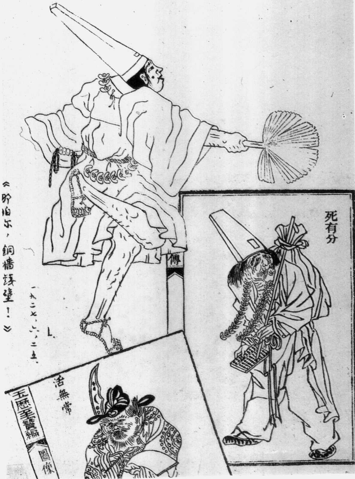 寫作《朝花夕拾》后記時,魯迅對兒時聽說的“無?!痹敿用枥L,并繪畫了一幅“無常圖”。上圖中上方為魯迅根據(jù)記憶中紹興迎神賽會中活無常的形象所繪制的畫作,下右側(cè)為魯迅從南京李光明莊本《玉歷鈔傳》中描出的“死有分”,下左側(cè)為魯迅從廣州寶經(jīng)閣本《玉歷》中描出的“活無?!?。顯然,魯迅所繪更勝一籌。