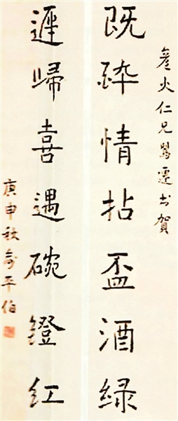 搬了多次家,俞平伯贈(zèng)的“既醉情拈杯酒綠,遲歸喜遇碗燈紅”始終掛在客廳