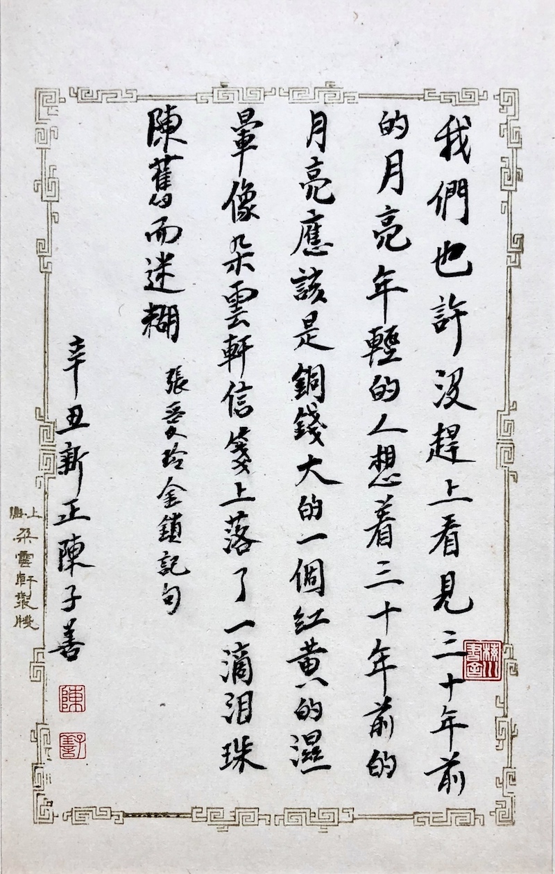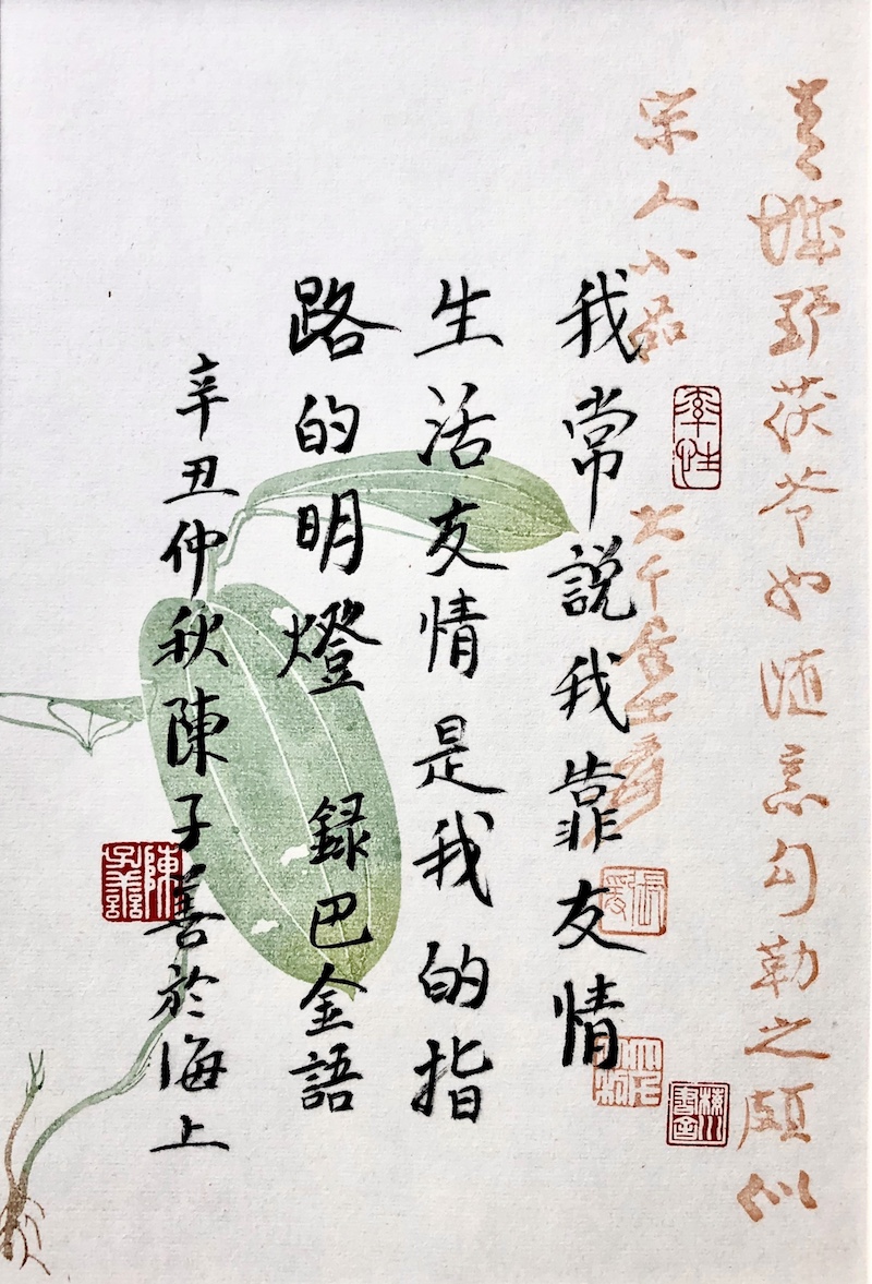 他帶給我們的最新驚喜,是這個(gè)世界上竟然會(huì)有一個(gè)“陳子善教授手錄新文學(xué)經(jīng)典墨跡展”。但這次的驚喜又和以往有所不同,它以“出圈的節(jié)奏”挑戰(zhàn)了我對(duì)陳老師才能的想象力。陳老師怕我驚喜得找不著方向,就在微信里介紹說(shuō):“我這墨跡展,字不怎么樣,但自以為獨(dú)創(chuàng)一格的,是我只寫新文學(xué)名家的名言雋語(yǔ),計(jì)有魯迅、胡適、周作人、郁達(dá)夫、徐志摩、梁實(shí)秋、林語(yǔ)堂、巴金、豐子愷、傅雷、張愛玲、木心等十二家的詩(shī)、對(duì)聯(lián)和警句。這是從未有過(guò)的,而且這些人也都是我研究過(guò)的……”我不禁揣想:陳老師對(duì)現(xiàn)代文學(xué)中這些人物星辰的感情究竟有多深不可測(cè)呢?他為這些人和書和文章以及與之有關(guān)的人和書和文章,獻(xiàn)了白天獻(xiàn)夜晚,獻(xiàn)了朝陽(yáng)獻(xiàn)夕陽(yáng),獻(xiàn)了簡(jiǎn)體獻(xiàn)繁體,獻(xiàn)了工作獻(xiàn)退休?,F(xiàn)在,又把墨跡獻(xiàn)出來(lái)了。