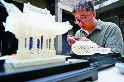在福建福州長樂區(qū)古槐鎮(zhèn)高樓村,高樓米線非遺傳承人陳國銳在制作工藝品。新華社發(fā)