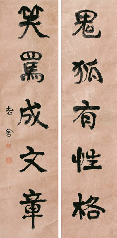 被冷風(fēng)吹硬了骨頭的老舍,由于自己的刻苦勤勉,果然成為一代大家,飲譽(yù)文壇。梁實(shí)秋曾將老舍與曹雪芹、李汝珍三人并稱為“三百年內(nèi)滿洲人中最杰出的三位小說家”。在寫作之余,老舍的愛好頗多,諸如打拳養(yǎng)花、書畫收藏與鑒賞等,對(duì)這些他都頗為內(nèi)行。老舍先生的書法作品,多為對(duì)聯(lián)和尺幅見方的詩(shī)稿或書信等,多是一手沉穩(wěn)而頗有意趣的楷書,清雅可人。老舍早年入私塾,寫字素有訓(xùn)練,后在北京師范學(xué)校時(shí),又受到校長(zhǎng)方還先生的賞識(shí)。方還是民國(guó)初期享有盛名的教育家和書法家,因而,在方校長(zhǎng)的影響下,老舍的書法起點(diǎn)甚高。盡管他在書法上的名氣和他后來(lái)在文學(xué)上的卓越成就不成比例,但我們今天品讀他的書法,還是覺得既有情致韻味而又不失法度。