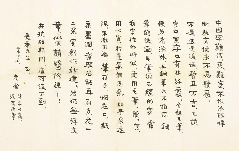 釋文:中國(guó)字難認(rèn),更難寫,不設(shè)法改掉它,教育便永不易發(fā)展。不過這是后話,暫且不言。且說寫中國(guó)字也有些好處,拿起毛筆便另有滋味,與鋼筆大不相同,鋼筆隨便畫,毛筆須正經(jīng)的寫。當(dāng)我寫作的時(shí)候,愛用毛筆慢慢寫,用心寫,于是氣靜思熟,如平泉遠(yuǎn)流,不激不竭,筆在手,煙在口,紙柔墨潤(rùn),案頭若能再有魚花一二朵,實(shí)創(chuàng)作妙境,若仍無(wú)好文章,似須請(qǐng)醫(yī)診視了!在抗戰(zhàn)期間,這可談不到。
