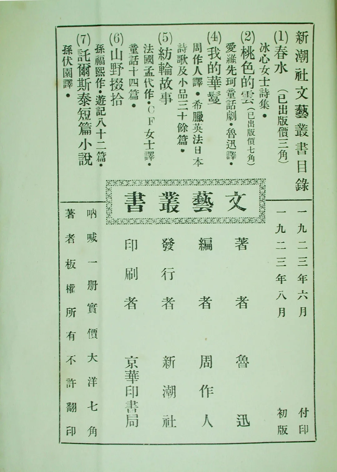 時間轉(zhuǎn)眼到了1923年初,魯迅已在報刊上發(fā)表了10多篇小說,此時在北大新潮社任主任編輯的周作人與魯迅商量,新潮社出版的《新潮》雜志與《新潮叢書》(社科類)銷路不大好,目前的經(jīng)費捉襟見肘,難以再維系下去。根據(jù)當下文學(xué)熱的形勢,不如轉(zhuǎn)到文學(xué)叢書方面,這樣可打開銷路。兄弟倆取得了一致的意見,開始運作編輯起《文藝叢書》(后改為《新潮社文藝叢書》)來,5月出版叢書第一種是冰心的詩集《春水》,7月出版第二種是魯迅翻譯愛羅先珂的童話劇《桃色的云》,8月出版第三種就是魯迅的第一部小說集《吶喊》,集中共收了魯迅親自編定的15篇小說,通紅封面黑方塊白字也是魯迅設(shè)計的,這種紅黑色醒目的搭配,在當時是很現(xiàn)代的。初版由京華印書局印了2000冊,為出《吶喊》魯迅墊付了200元印費?!秴群啊肥艿阶x者熱烈的追捧,不出三個月就售完了, 12月再版印了2500冊,此后到1936年魯迅去世時又再版了20多次。后來的再版本與初版本不同之處是封面黑方塊中“吶喊 魯迅”的字體由原來的鉛字印刷體改為魯迅手寫美術(shù)體了,集中被魯迅抽去了一篇《不周山》變成14篇了。90年過去了,《吶喊》依然閃爍著它那耀眼的光輝。