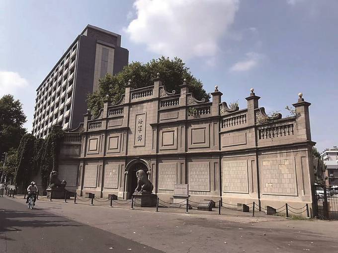 經(jīng)歷了100多年的風雨滄桑,江南水師學堂的部分建筑依然保留了下來,以“江南水師學堂遺跡”之名被列為省級文物保護單位,現(xiàn)存當年的英籍教官樓、四合院式寢室、講堂、半邊亭、長廊、牌樓式大門等建筑,另外還有“槍炮”“魚雷”等石刻門額。最為引人注目的是中山北路346號門前的那座牌樓式大門,平面呈圓弧形,立面均勻分布十根裝飾門柱。從門樓正中頂部開始,設有斜向兩側的層層退臺,共有五層,上面裝飾有具有動感的、巴洛克風格的曲線漩渦花紋,旁邊一左一右還矗立著兩只威武的石獅。