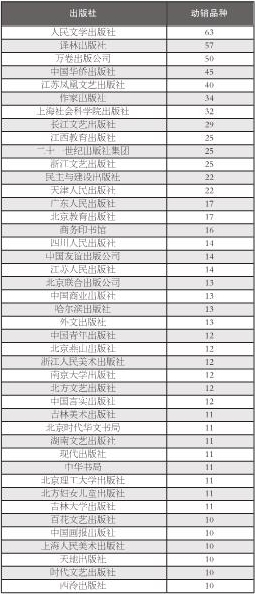 從動銷品種看(見表 1),人民文學出版社的魯迅著作鋪陳魯迅思想成果,以63種動銷雄踞榜首;譯林出版社的魯迅著作再續(xù)文學經典輝煌,其動銷品種為 57種;萬卷出版公司的魯迅著作以魯迅文集為主要形式,動銷品種為50種,位列第三。中國華僑出版社等10 家出版社的魯迅著作動銷品種為20~50 種;廣東人民出版社等 31 家出版社的魯迅著作為10~20種。