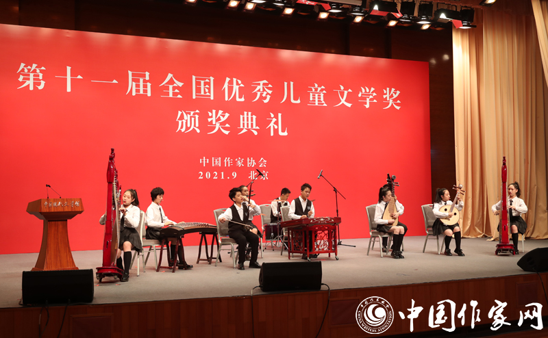 頒獎典禮上,來自北京朝陽實驗小學(xué)合唱團(tuán)、少年國風(fēng)室內(nèi)樂團(tuán)等的演員們帶來了精彩的演出。歌曲《童心向黨歌曲聯(lián)唱》《我們是共產(chǎn)主義接班人》《快樂成長》《心中國》等仿若天籟,宛轉(zhuǎn)悠揚。澄澈的目光,燦爛的笑容,經(jīng)久的掌聲??作為對文學(xué)最好的饋贈,一起定格成這個秋夜最溫暖的記憶,新時代的中國兒童文學(xué)由此將踏上新的征程。
