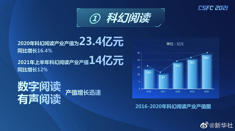 2021中國科幻大會最新發(fā)布的《2021中國科幻產業(yè)報告》顯示,今年上半年,我國科幻產業(yè)產值已達362.92億元。其中,上半年科幻閱讀產業(yè)產值14億元,同比增長12%,數字閱讀、有聲閱讀產值增長迅速。