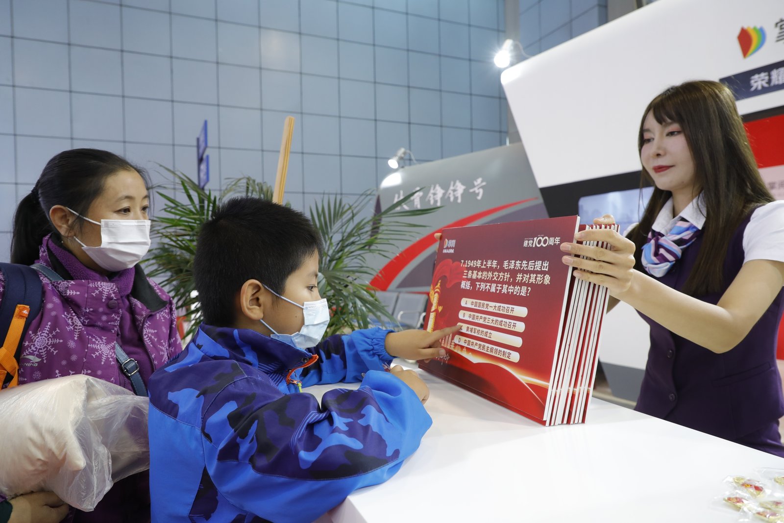 在游戲互動區(qū),特別策劃的黨史知識問答活動吸引了觀展游客的目光,前來挑戰(zhàn)問答的觀眾絡(luò)繹不絕,排起了長隊。在輕松愉快的游戲氛圍中,大家對中國共產(chǎn)黨百年奮斗進行了深入的了解學(xué)習(xí),通過互動的形式,享受了一程極具紅色教育 意義的觀展體驗。
